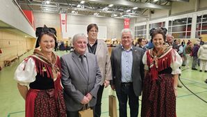 Bürgermeisterin Marion Isele, Mitte, ehrte beim Neujahrsempfang Erwin Vollmer, links und Thomas Kaiser, rechts, sowie in Abwesenheit Ringer Darius Kiefer im Beisein der Trachtengruppe.